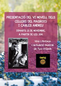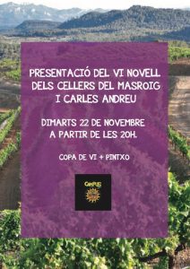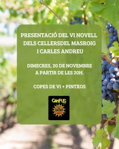 Un any més fidels, fidels a la tradició, al Bar Campus presentem els vins novells dels cellers del Masroig (DO Montsant) https://cellermasroig.com/ i Carles Andreu (DO Conca de Barberà) https://cavandreu.com/ acompanyats de pintxos de porc. Els podeu tastar a copes o bé comprar-ne ampolles. El primer vi de la collita, amb tot el sabor i frescor de la fruita recent collida. I aquest any amb actuació musical inclosa a càrrec dels Two O’Clock. Serà el dimarts 21 de novembre a partir de les 20h. Us hi esperem!