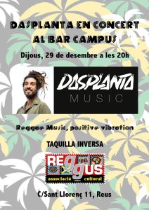 El músic brasiler i cantant de reggae Alessandro ‘Dasplanta’ ens oferirà un concert repassant temes clàssics de la música reggae. Quan va venir a parar a Reus fa uns anys, la primera actuació que va fer va ser al Bar Campus.